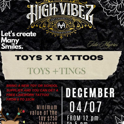 High Vibez Tattoo Studio – Monday 4th – Thursday 7th – 12 PM-5 PM (toy min. value of 250 MXN, in exchange for line work tattoo 5-11cm)